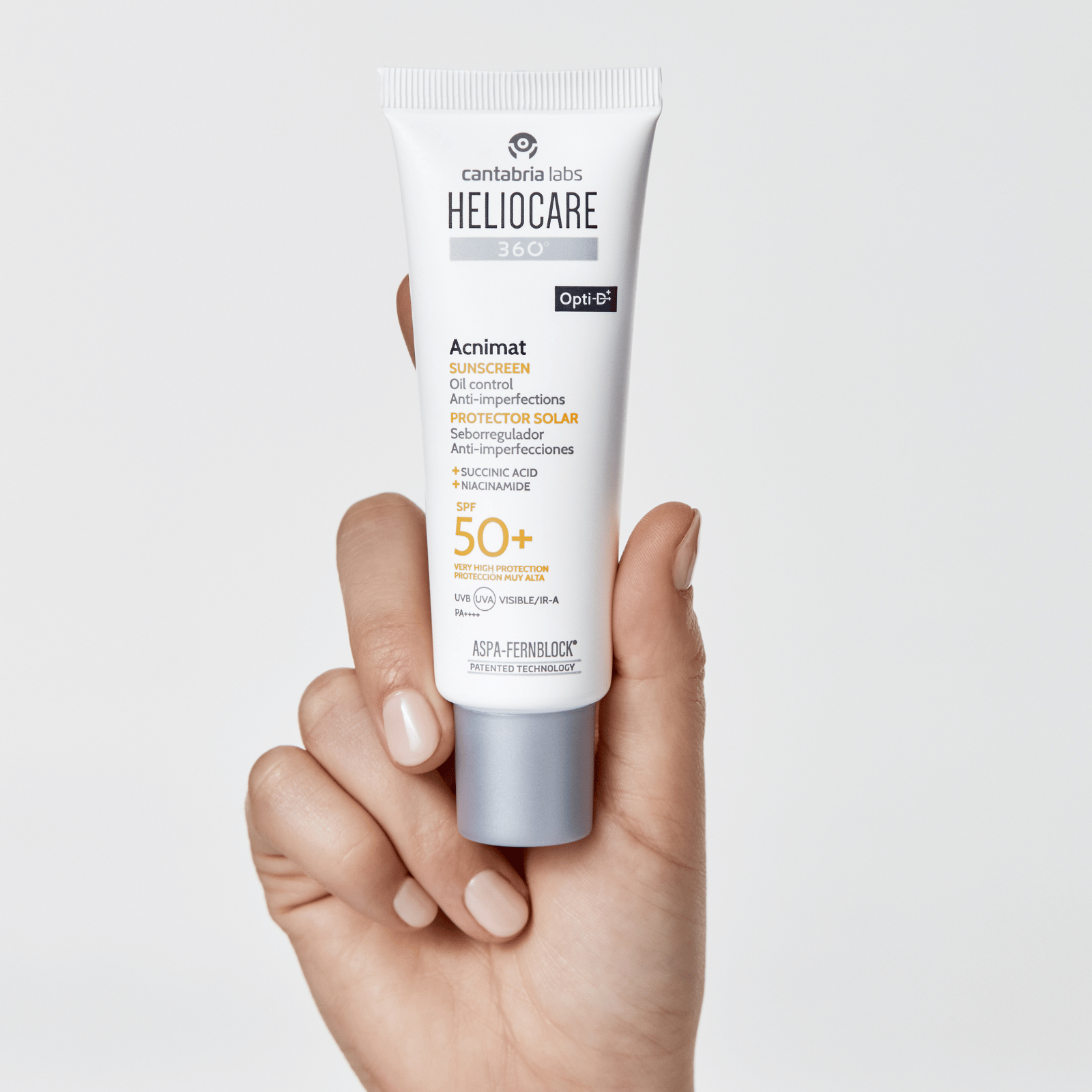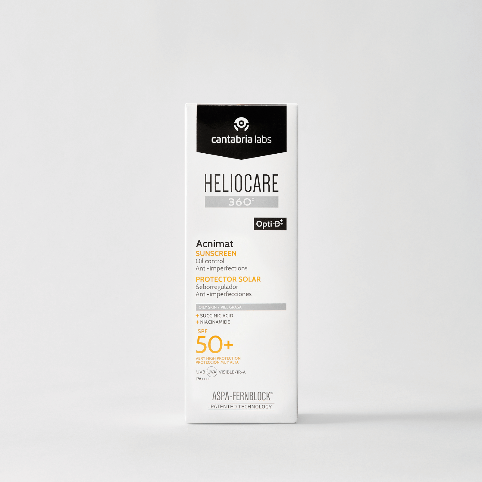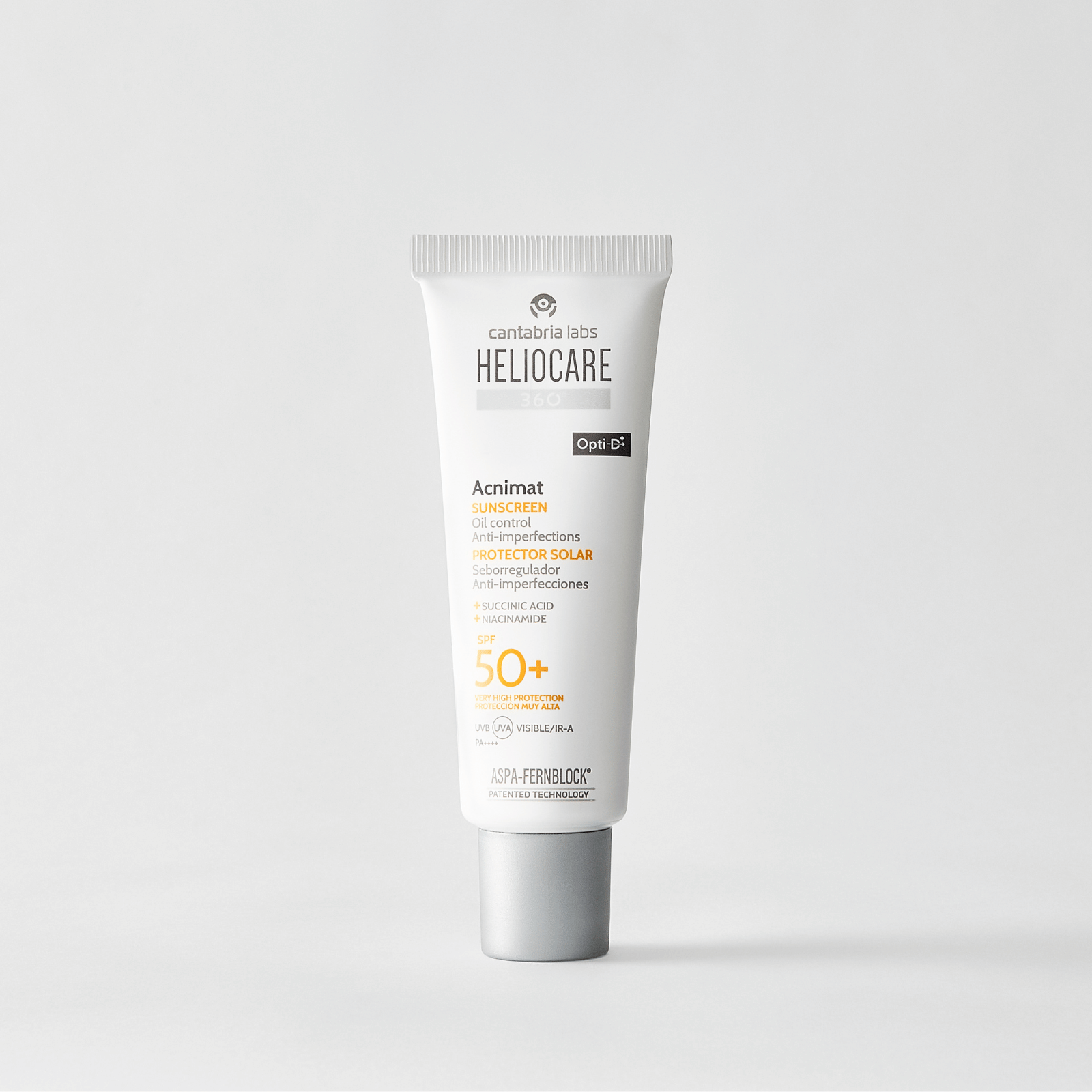 Heliocare 360º Acnimat este o cremă de protecție solară cu spectru larg (UVB, UVA, lumină vizibilă și infraroșu), având un SPF 50+, destinată utilizării zilnice pe pielea grasă, cu tendință acneică. Aceasta oferă o acțiune anti-imperfecțiuni și seboregulatoare datorită unui sistem specific compus din acid succinic și niacinamidă.